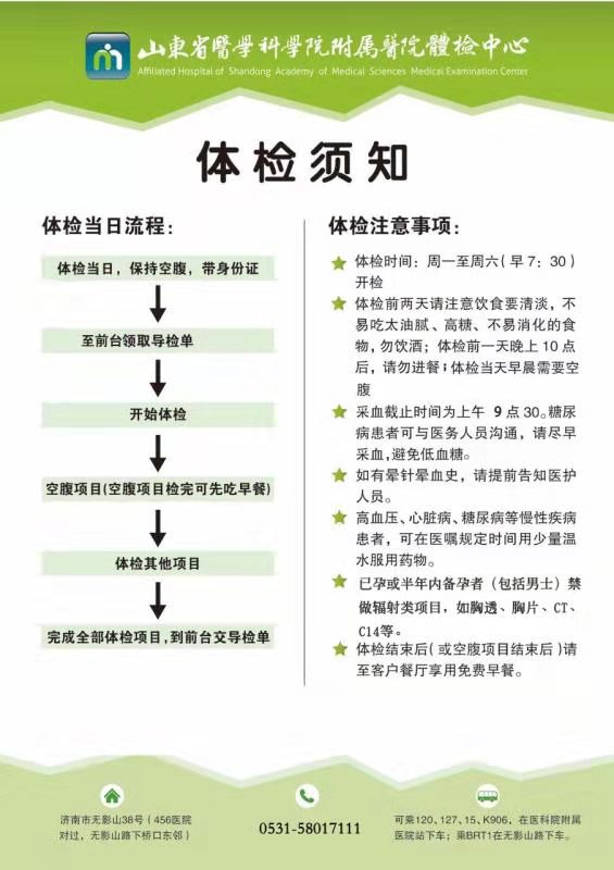 (二)體檢地點(diǎn):山東省醫學(xué)科學(xué)院附屬醫院體檢中心(位置:濟南市無(wú)影山38號(456醫院對面)1號樓查體中心);